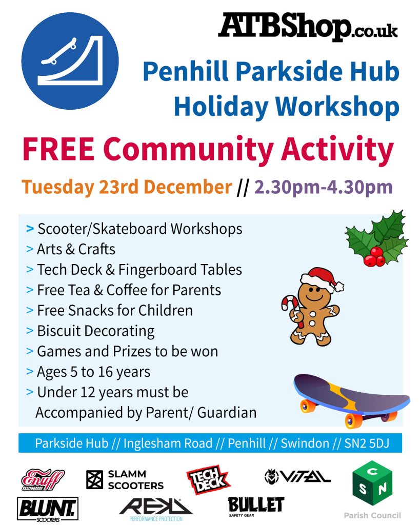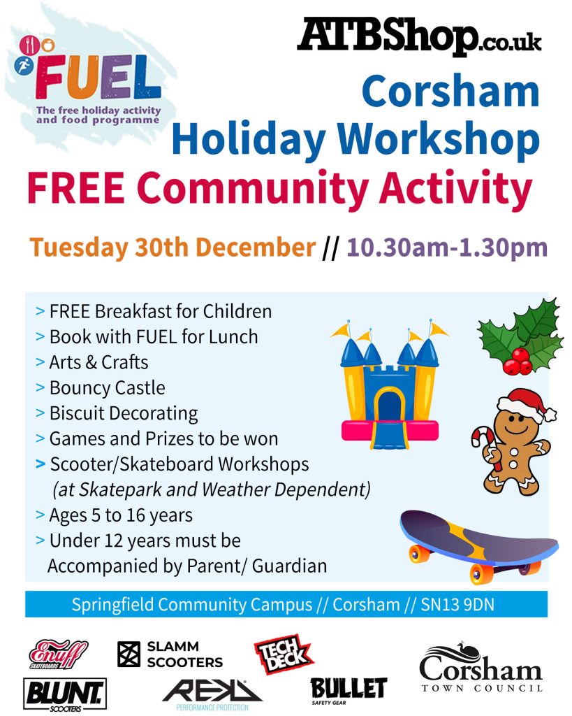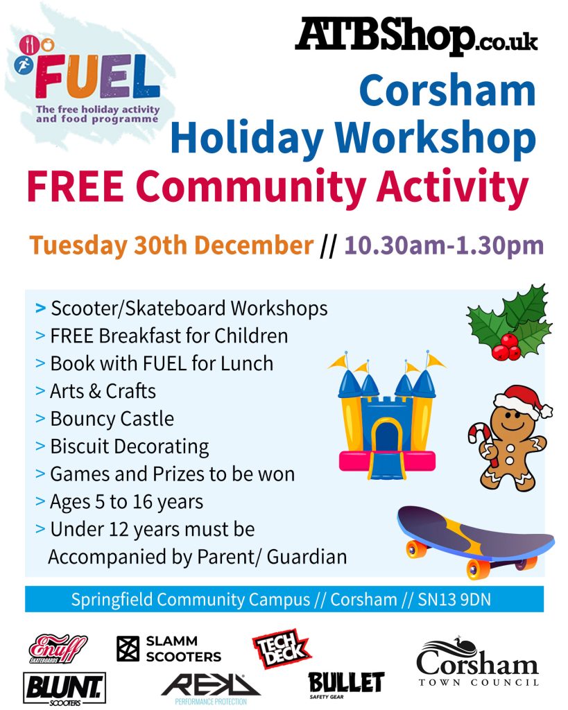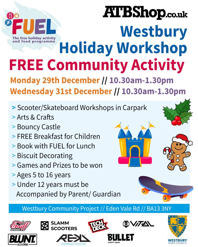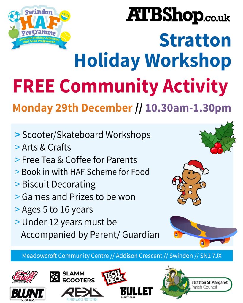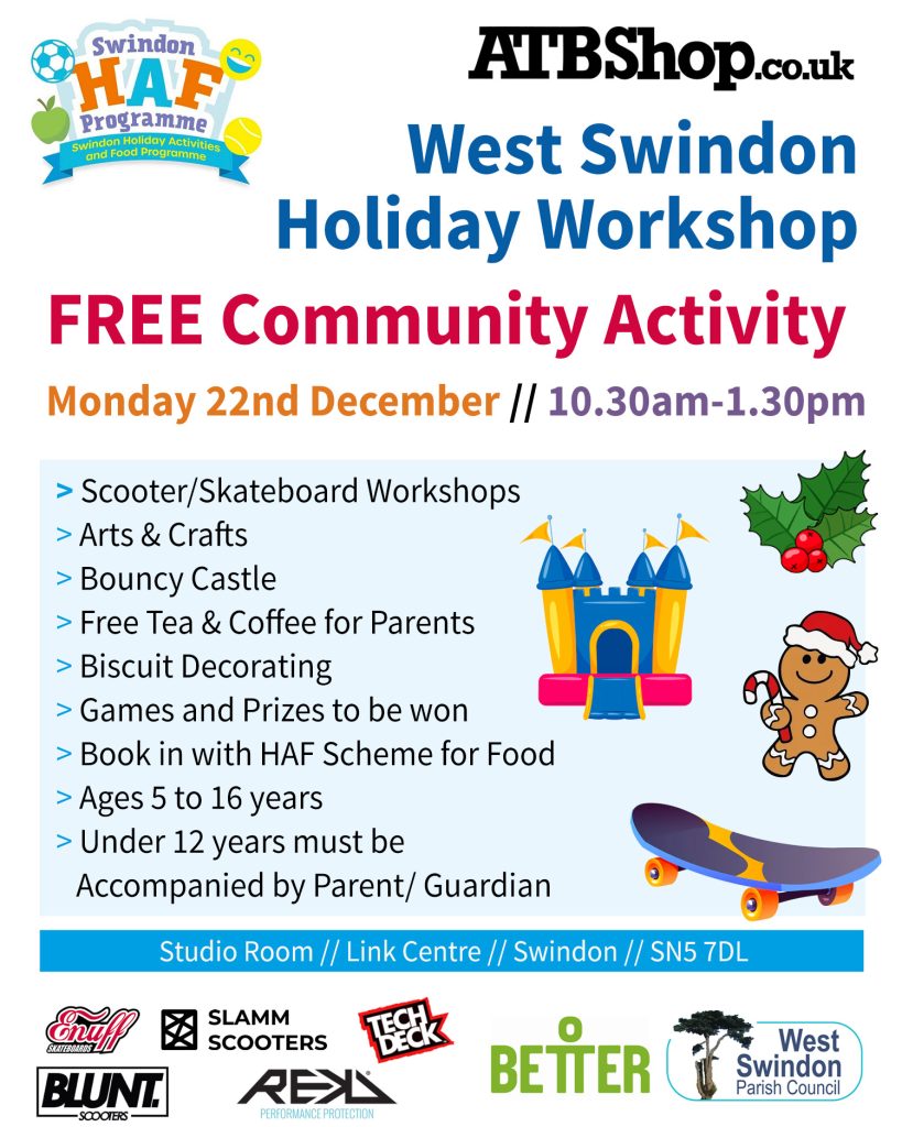 We have a series of Holiday Club community events partnered with Swindon HAF and Wiltshire FUEL over the Christmas Holidays across Swindon and Wiltshire. These are events for 5-16 year olds and can be accompanied by family too. There are all sorts of fun activities based on the weather and venue facilities available. Please see the posters below for details of each event. If you are part of the HAF or FUEL schemes then you can book through their systems to food supplied at the event. Participation is open to all users and free to all it is only the food that needs booking.