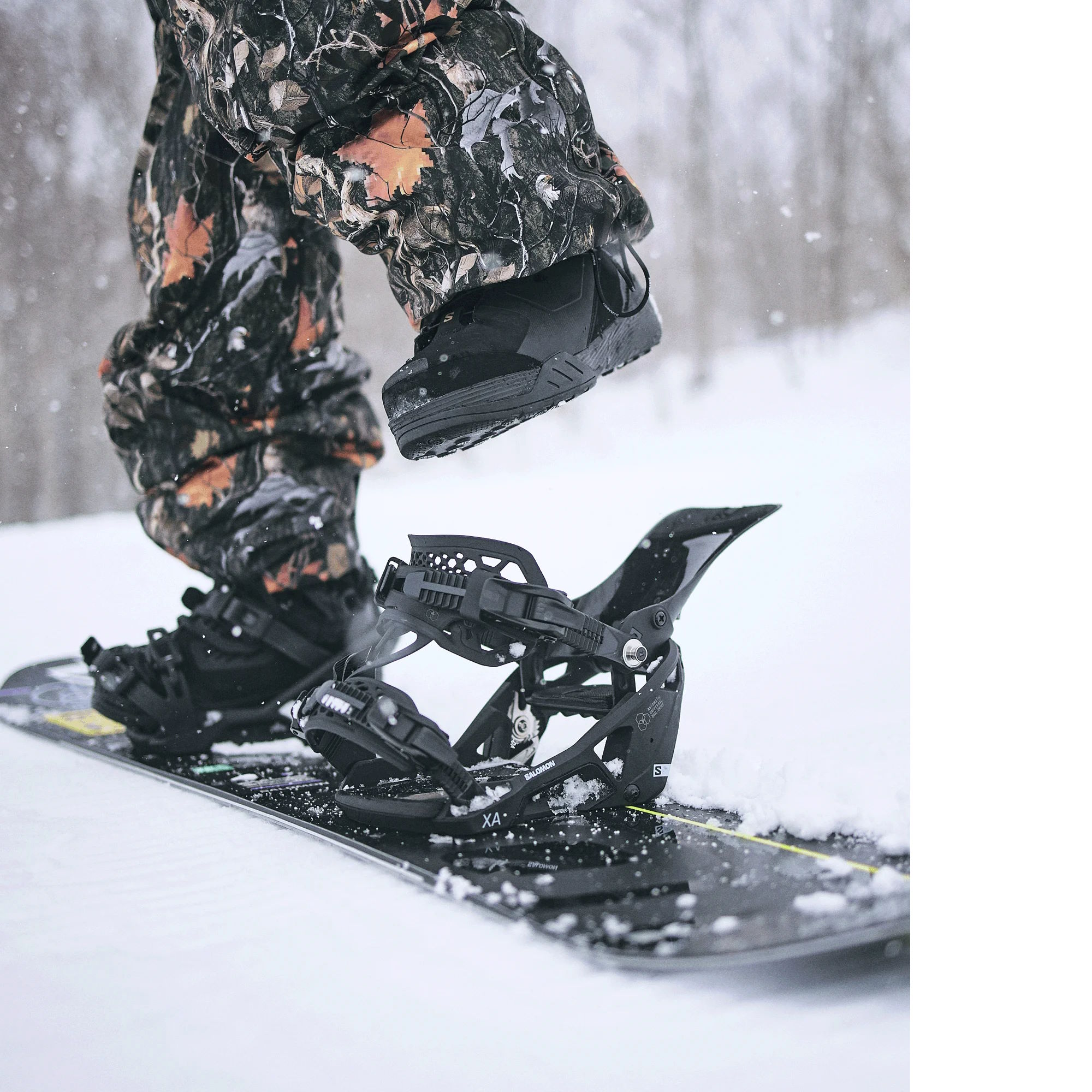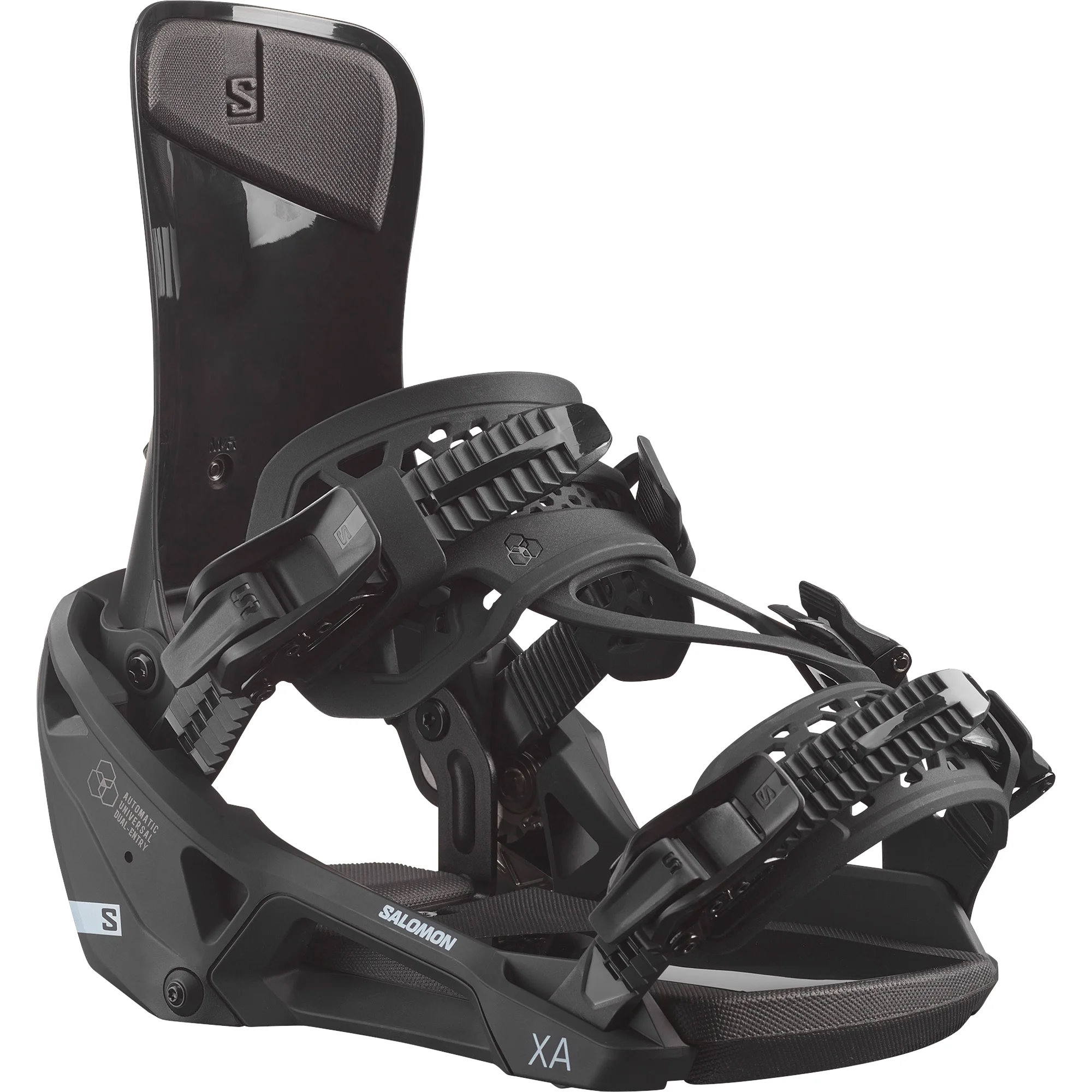 The XA Supermatic bindings from Salomon are a collaboration between two giants in Snowboarding. Using the Nidecker fast entry system partnered with Salomon's medium to stiff asymmetrical highback offers a great binding for someone who is need of a binding they're able to push to their limit and get the feedback and the riding they desire, whilst also offering the fast entry/exit system to keep up with the Skiers off of the lift.